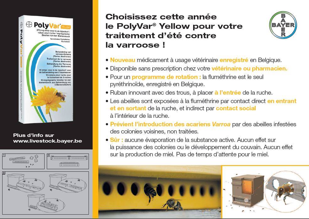 Je reviens justement de la conférence donnée à Wegimont par Étienne Bruneau sur l'utilisation des cagettes Scalvini. Il a aussi parlé de ce nouveau médicament. Ce produit est appliqué idéalement entre 9 semaines et 4 mois, moralité on le retrouve inévitablement dans les cires et dans le miel a des concentrations qui pourraient entrainer le déclassement en cas de contrôle.