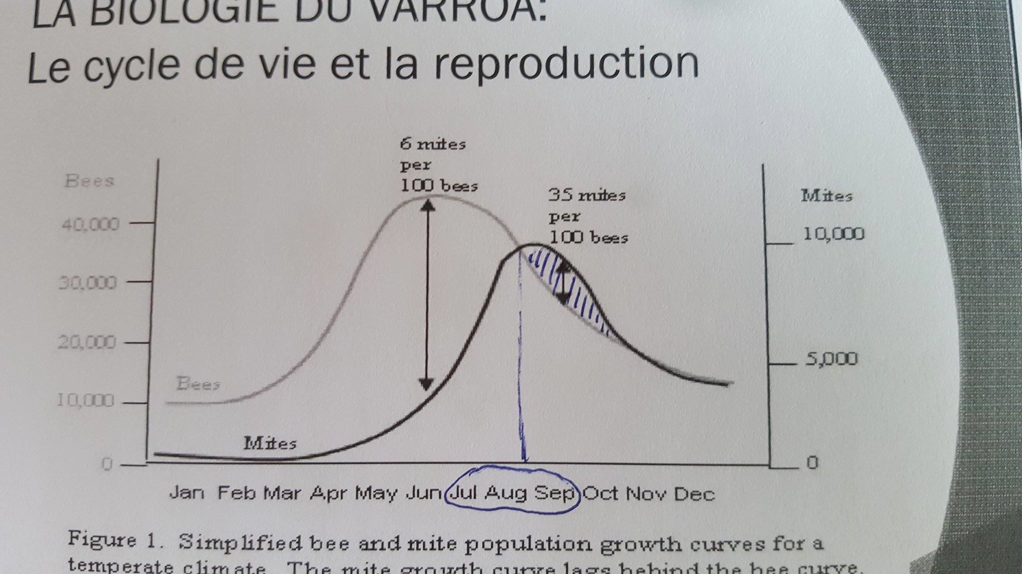 - Evolution du varroa par rapport a la colonie ( un graphique montre mieux que de longues explications, on voit tres bien que la zone critique se situe en juillet aout septembre , date ou il faut traiter )