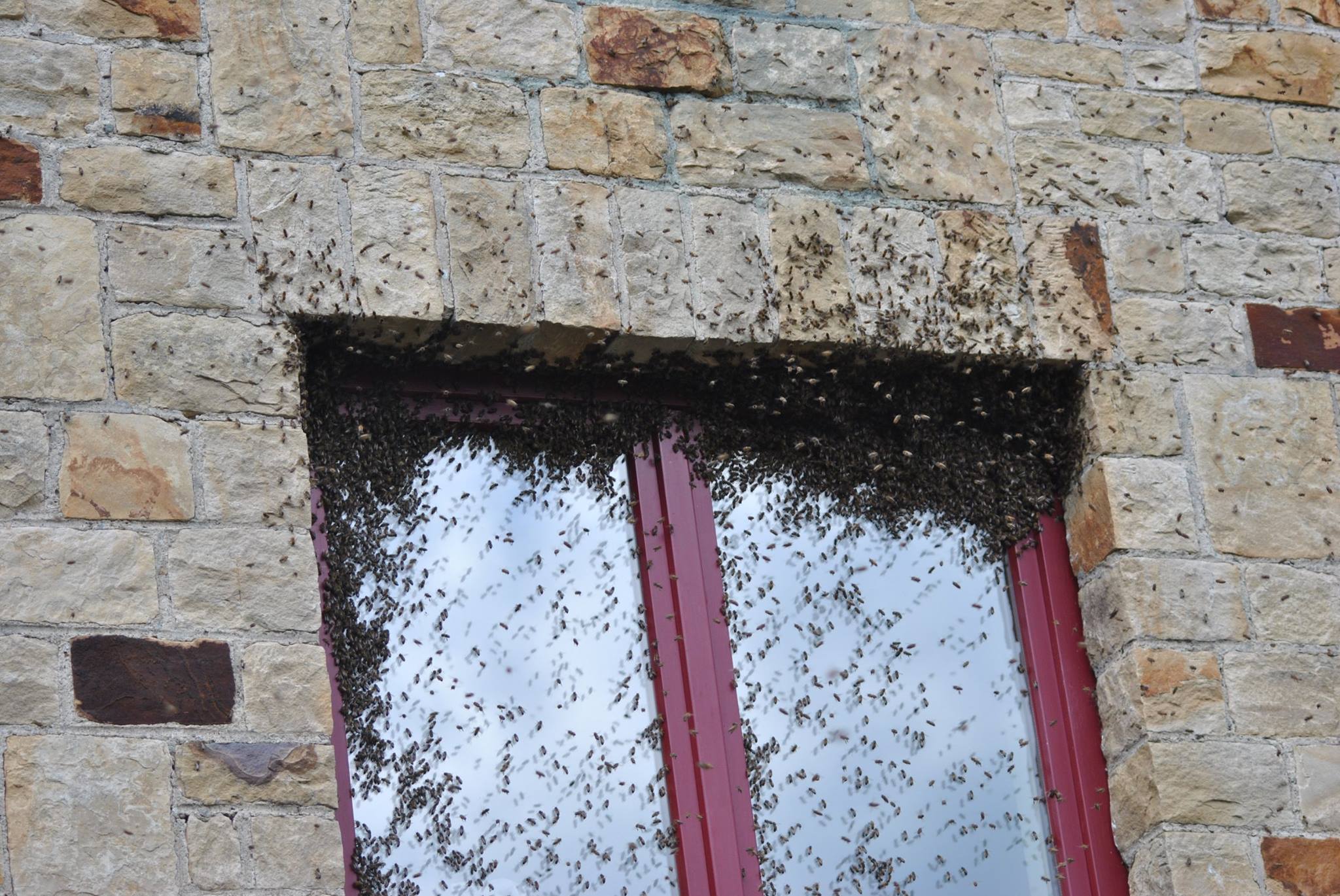 doum a écrit:Je vais vous montrer une photo pour que vous visualisiez où elles se trouvent dans le mur. Cette photo les représente le jour de leur arrivée et la fenêtre est celle le plus près de la porte d'entrée (+- 1m). On passe dessous chaque jour quand on entre ou sort de la maison. Il y a trois autres fenêtres identiques le long de la façade et elles sont présentes, je pense, au niveau des 4 fenêtres. Probablement sont-elles tout le long de la façade. Cela veut-il dire qu'il y a plusieurs reines (je n'y connais rien) ? Et si on les laisse jusqu'à l'hiver, je suppose que la reine s'en va (ou qu'elle meurt) et alors on pourrait peut-être refermer les entrées à ce moment-là non ? Ainsi on les garde bien vivantes pendant la belle saison, puis quand elles s'en vont, on referme. Ou bien restent-elles enfermées l'hiver ? J'avoue que je ne sais pas...