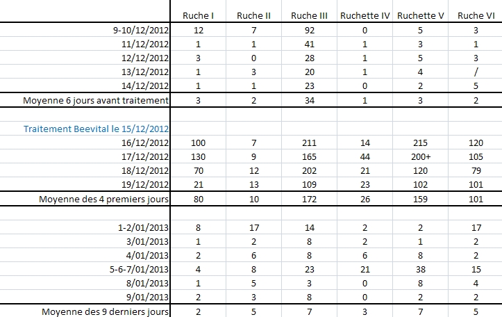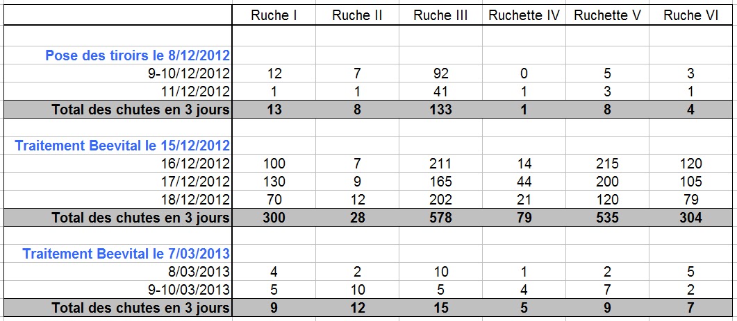 J'ai remanié le tableau précédent pour cette fois obtenir des totaux de chutes sur trois jours plutôt que des moyennes. Trois jours c'est peu mais ça donne déjà une idée de l'infestation avant et après traitements.