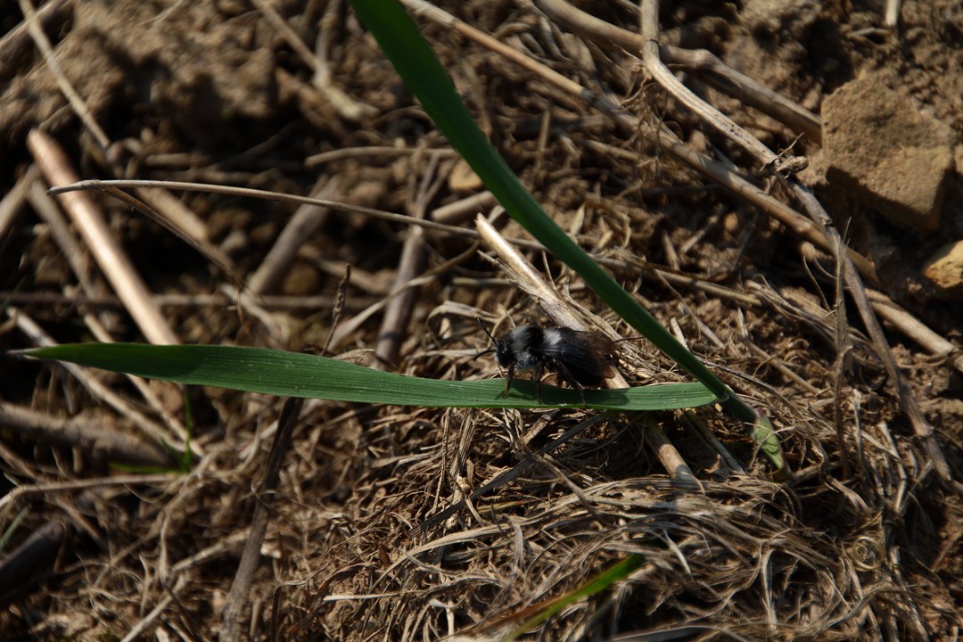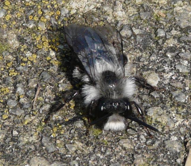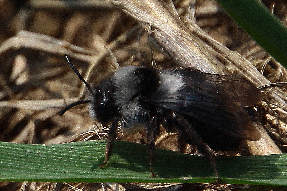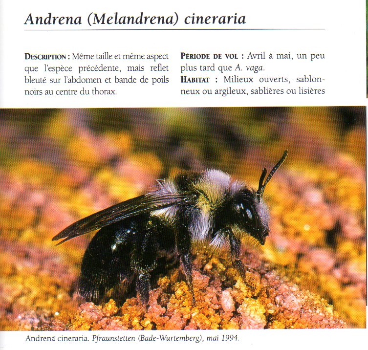 Andrena cineraria, à ne pas confondre avec Andrena vaga qui n'a pas cette bande de poils noirs sur le thorax.