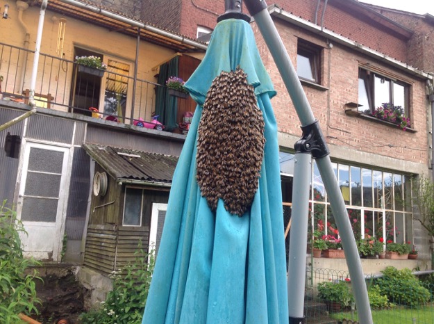 Aujourd'hui, j'ai été appellé pour un essaim qui était posé depuis 4 jours sur un parasol!!!