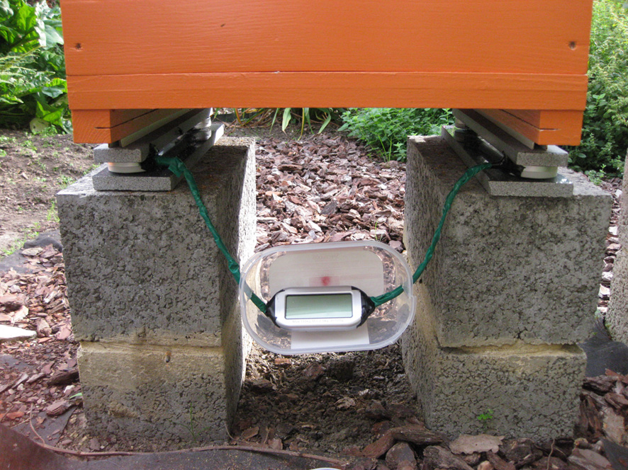 J'ai bricolé une balance qui est installée sous la ruche. Bricolage: à partir des capteurs de pression d'un pèse personne (15€). On les démonte, on allonge les fils entre les capteurs, on isole de l'humidité et on les installe sous la ruche. L'afficheur à l'arrière de la ruche. Une petite pression sous la ruche ... et la pesée est faite !) . Ainsi tout l'hiver, tu connais l'état des réserves.