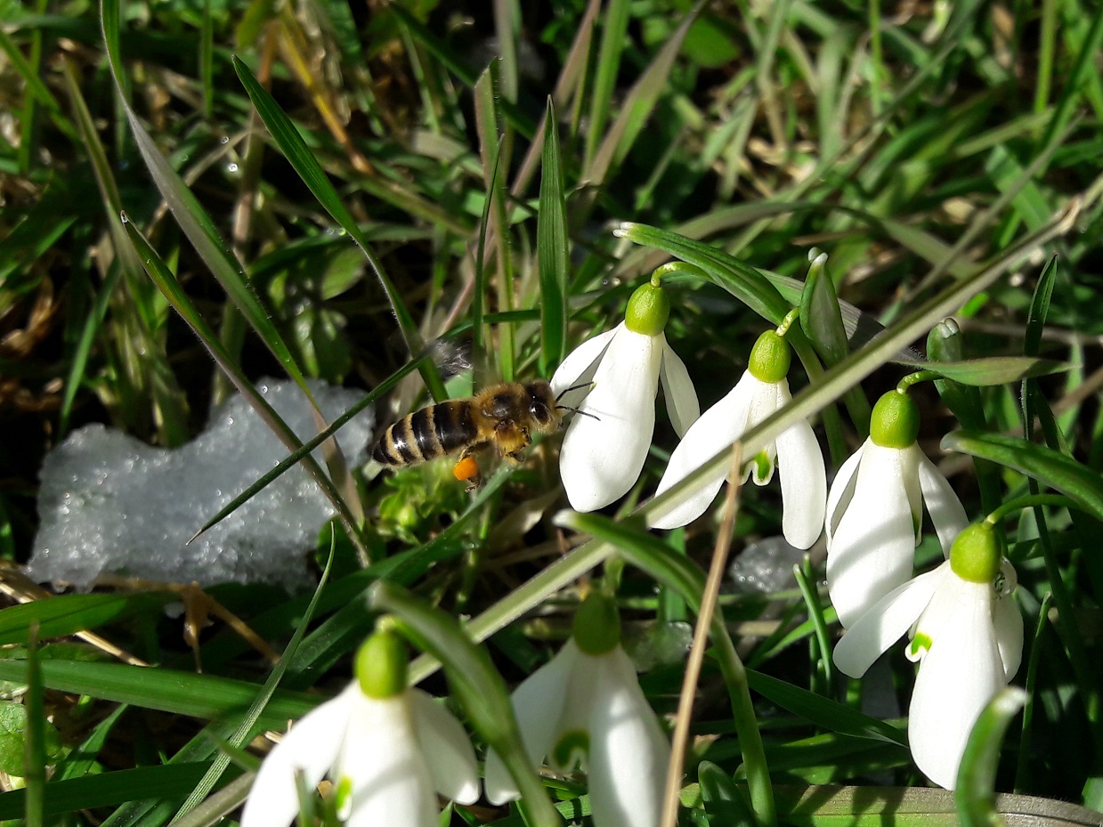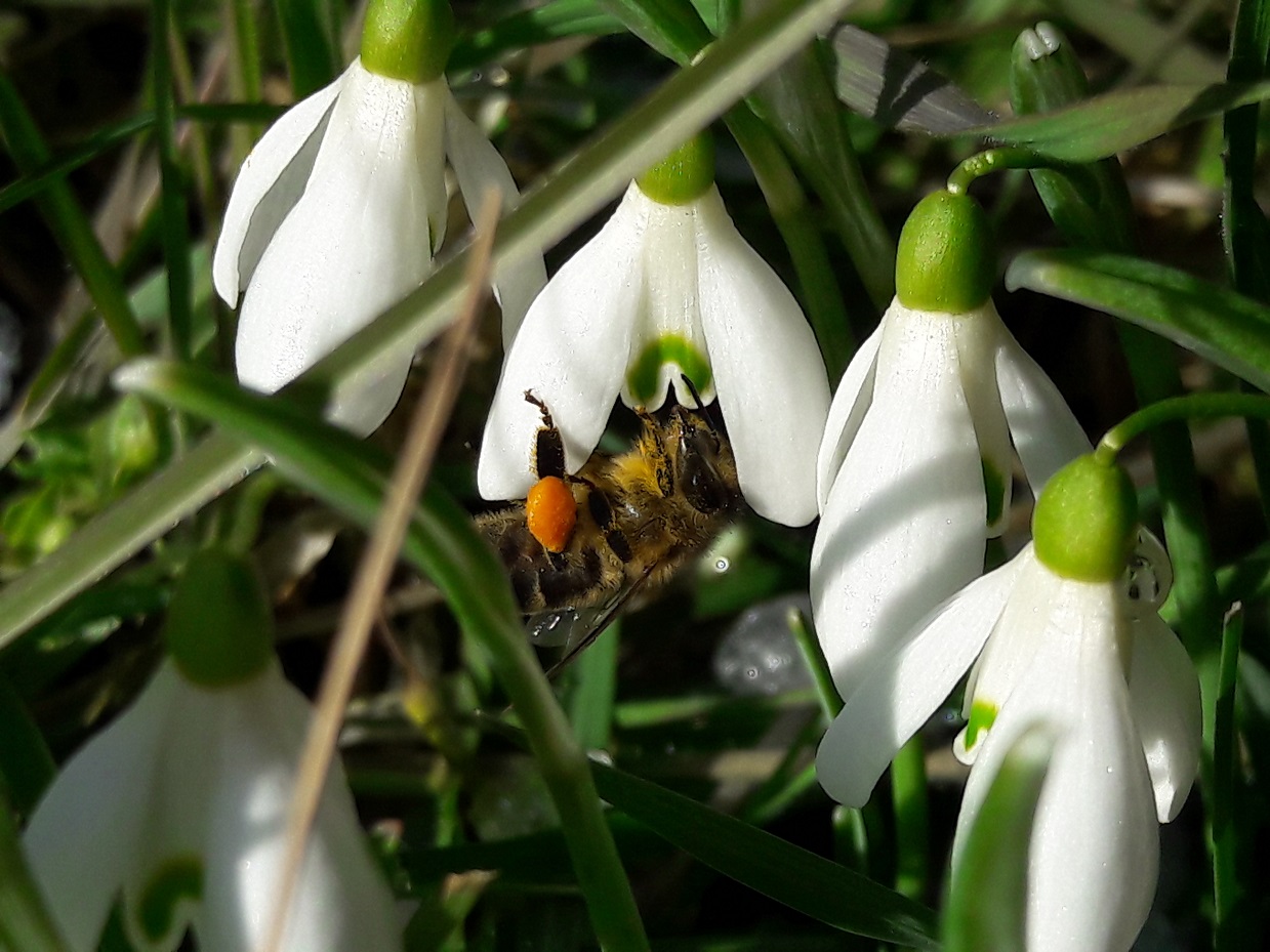 Pollen orange pour le crocus et les perces-neiges, jaune pour le cornouiller mâle, jaune clair pour le noisetier.