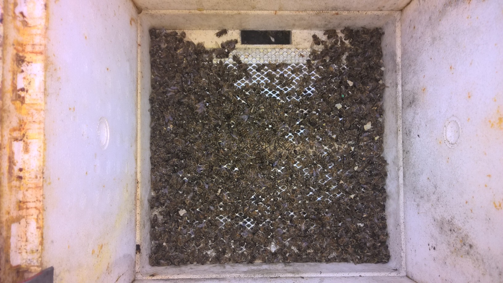 Je l'ai remarqué lors du traitement hivernal ce midi. Il restait une 30aine d'abeilles en vie dans l'élément supérieur rempli de provisions operculées. L'élément inférieur ne comportait que des des cellules vides (couvain né) + miel en périphérie, mais pas un gramme de pollen ! Sur le fond, la petite colonie effondée, avec les 2 reines bien visibles.