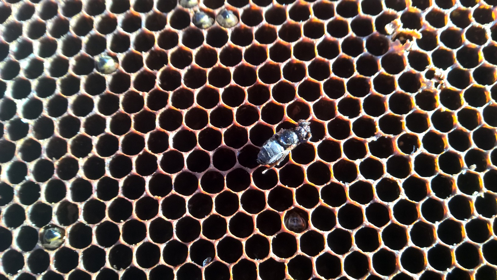 2ème photo : 1 cadre de l'élément inférieur, où il reste quelques abeilles prêtes à naître, quelques abeilles la tête dans l'alvéole et.... quelques oeufs !