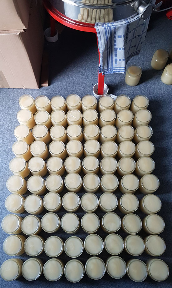 Pour le poids je pèse de temps en temps, il suffit d'avoir des repères et on reste assez proche des 500gr, parfois j'en mets trop quand le miel est très épais.