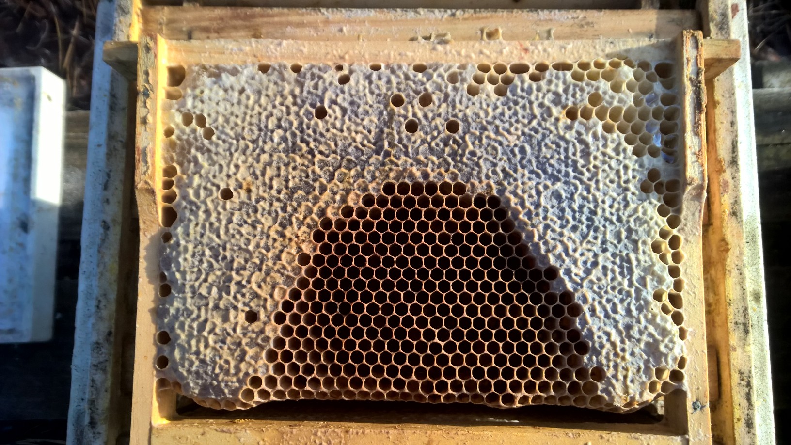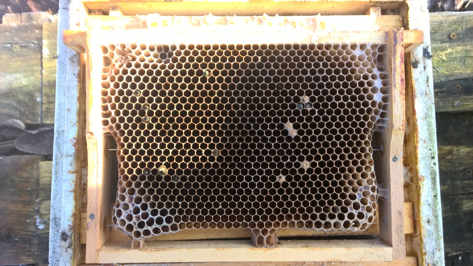 Je l'ai remarqué lors du traitement hivernal ce midi. Il restait une 30aine d'abeilles en vie dans l'élément supérieur rempli de provisions operculées. L'élément inférieur ne comportait que des des cellules vides (couvain né) + miel en périphérie, mais pas un gramme de pollen ! Sur le fond, la petite colonie effondée, avec les 2 reines bien visibles.