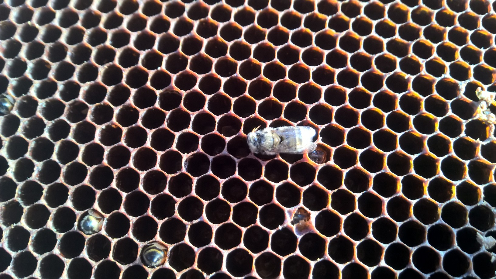 3ème photo : 1 des dizaines d'abeilles de couvain operculé et qui n'avait pas encore émergé